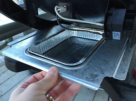 После этого вытащите съемный лоток для стекания жира, достаньте из него одноразовый алюминиевый поддон и выбросьте его. Не забудьте протереть съемный лоток сухой тряпкой перед использованием и установите в него новый одноразовый поддон. Эту операцию следует проводить регулярно, поскольку слишком большой слой осадочного жира может воспламениться.